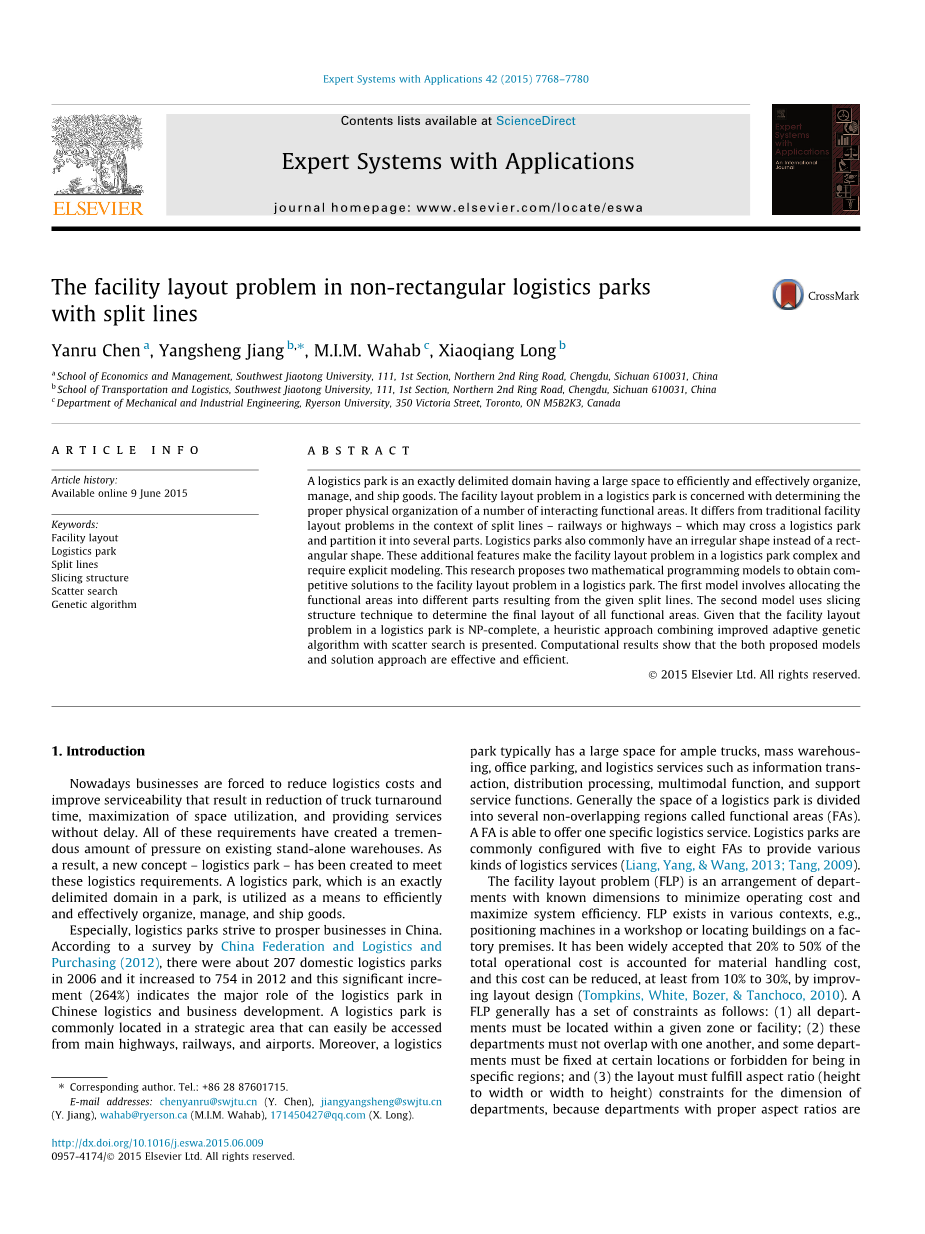 随着物流园区的快速发展,物流园区规划越来越受到业界和学术界的关注。Scaron;ulgan(2006)提出了物流园区的基本特征并提出了理论的物流园区发展。Zeng (2008)在定性分析各功能区与物流园区交通条件相互关系的基础上,提出了机场物流园区的布局。系统规划方法(SLP)(如Muther, 1961)是一种定量重新安排现有设施或布置新设施的实用而有组织的方法,被广泛应用于FLP-LP中。由于SLP是手工和主观地安排部门的,这是一项耗时的工作过程,特别是当问题的规模很大时。此外,不同的规划人员可能会得到不同的布局解决方案。这些解决方案需要重新调整为实际的解决方案。因此,将SLP与数学模型相结合。例如,FAs, Feng, Jing, and Yang (2012), Sun, Ma, and Zhang (2015), and Xu(2015)之间存在着综合关系和邻接关联度,他们建立了一个结合SLP的数学模型,并通过GA求解,使综合关系或土地利用最大化,同时物流成本最小化。同样的方法,Zhang, Jiang, Zhang, and Wei(2014)最大化了综合关系和邻接关系的产品协会的程度。这种方法的缺点之一是需要功能区之间关系的信息,而从一些物流园区很难获得这些信息。因此,在Ma, Mao, and Li(2008)中,采用模糊聚类理论和仿真代替SLP求解矩形FLP-LP。Ma等人(2008)提出的方法也可用于求解非规则物流园区。然而,为了使用仿真技术,需要大量的信息,如功能区的平均使用时间和物流设备的效率。通常很难获得这样的资料,特别是对新计划建造的一座大楼。