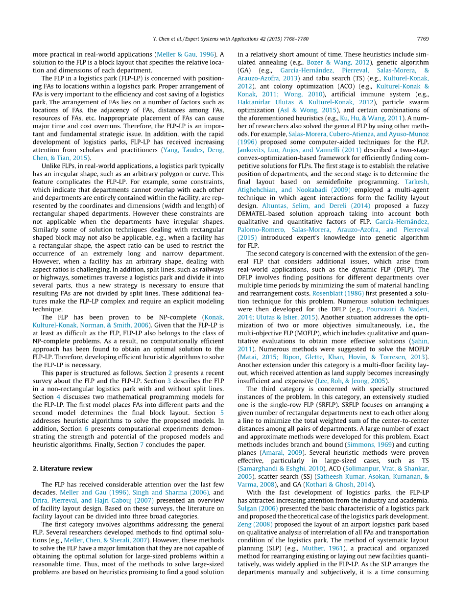 第一类涉及处理一般FLP的算法。一些研究人员开发了寻找最优解的方法(例如,Meller, Chen, amp; Sherali, 2007)。然而,这些求解FLP的方法存在一个主要的局限性,即不能在合理的时间内得到大型问题的最优解。因此,大多数解决大型问题的方法都是基于启发式的,它承诺在相对较短的时间内找到一个好的解决方案。这些启发式包括模拟退火(如Bozer amp; Wang, 2012)、遗传算法(GA)(如Garcia-Hernandez, Pierreval, Salas-Morera,amp; Arauzo-Azofra, 2013)和禁忌搜索(TS)(如Kulturel-Konak, 2012)、蚁群优化(ACO)(如Kulturel-Konak amp; Konak, 2011;Wong, 2010),人工免疫系统(如Haktanirlar Ulutas amp; kultuire - konak, 2012),粒子群优化(Asl amp; Wong, 2015),以及上述启发式的某些组合(如Ku, Hu, amp;Wang, 2011)。一些研究人员也用其他方法解决了一般的FLP问题。例如,Salas-Morera、Cubero-Atienza和Ayuso-Munoz(1996)提出了FLP的一些计算机辅助技术。Jankovits, Luo, Anjos和Vannelli(2011)描述了一个基于对流优化的两阶段框架,用于高效地为FLPs寻找具有竞争力的解决方案。第一阶段是确定各部门的相对位置,第二阶段是基于半定规划确定最终布局。Tarkesh, Atighehchian和Nookabadi(2009)采用了一种多智能体技术,其中智能体交互构成了设施布局设计。Altuntas、Selim和Dereli(2014)提出了一种基于demat的模糊求解方法,同时考虑了FLP的定性和定量因素。Garcia-Hernandez、Palomo-Romero、Salas-Morera、Arauzo-Azofra和Pierreval(2015)将专家知识引入FLP遗传算法。