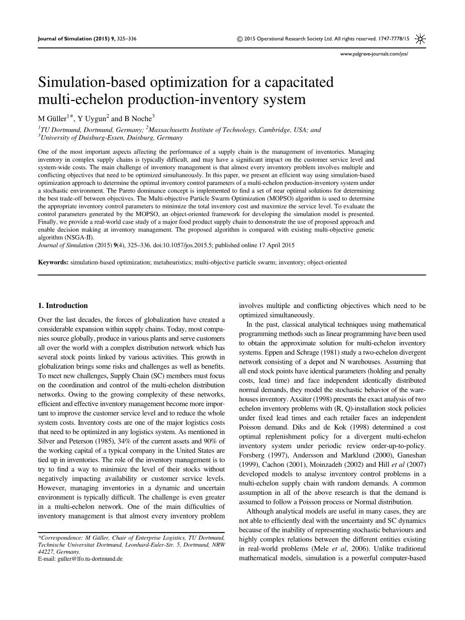 在本文中,我们提出了一个基于模拟的优化模型,该模型基于元启发式算法中的MOPSO。我们的研究在某些方面不同于以上所列,如复杂因素的多样性、随机的客户需求、将距离和数量相关的运输成本纳入库存政策以及有限的生产能力。本研究的主要目的是在随机环境下,为多级产能约束的生产库存系统中的每个设备找到最优库存策略。粒子群优化算法的简要描述见“粒子群优化算法概述”一节。“问题的数学公式”和“基于模拟的优化方法”部分分别给出了数学公式和基于模拟的优化方法的细节。“案例研究和计算结果的描述”一节讨论了案例研究和计算结果。最后,“结论”部分总结了当前的工作,并为进一步的研究提供了方向。