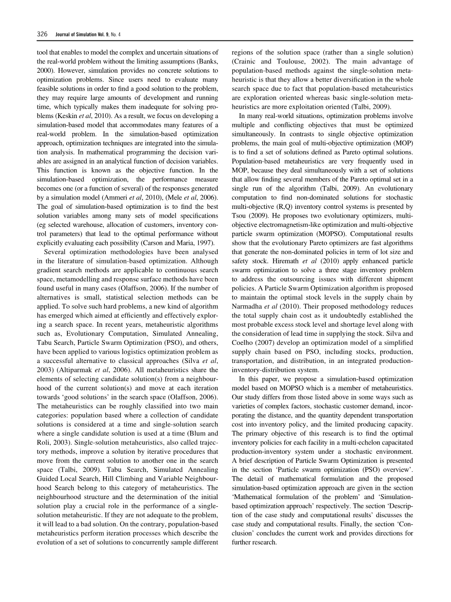 在许多实际情况下,优化问题涉及多个相互冲突的目标,必须同时进行优化。与单目标优化问题相比,多目标优化的主要目标是找到一组被定义为帕累托最优解的解。基于群体的元启发式算法在MOP中使用非常频繁,因为它们同时处理一组解,这些解允许在算法的单次运行中找到帕累托最优集的几个成员(Talbi,2009)。邹语(2009)提出了一种为随机多目标库存控制系统寻找非支配解的进化计算方法。他提出了两种进化优化器,多目标类电磁优化和多目标粒子群优化。计算结果表明,进化帕累托优化器是产生批量和安全库存非支配策略的快速算法。Hiremath等人(2010)应用增强粒子群优化算法来解决三阶段库存问题,以解决不同装运策略的外包问题。Narmadha等人(2010)提出了一种粒子群优化算法来维持供应链中的最优库存水平。他们提出的方法减少了整个供应链成本,因为它无疑确定了最可能的过剩库存水平和短缺水平,同时考虑了供应库存的准备时间。Silva和Coelho (2007)开发了一个基于粒子群优化算法的简化供应链的优化模型,该模型包括在集成的生产-库存-分销系统中的库存、生产、运输和分销。
