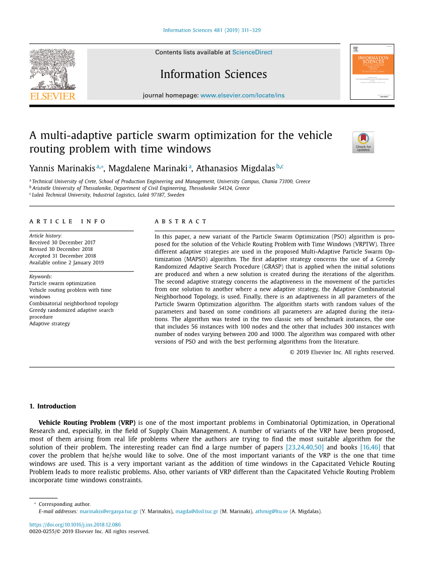摘要:本文提出了一种新的粒子群优化(PSO)算法变体,用于解决带时间窗的车辆路径问题(VRPTW)。对于所提出的多自适应粒子群优化(MAPSO)算法,我们使用了三种不同的自适应策略。第一种自适应策略涉及使用贪婪随机自适应搜索过程(GRASP),该过程应用于生成初始解决方案时以及在算法迭代期间创建新解决方案时。第二种自适应策略涉及粒子从一种解决方案到另一种解决方案的运动中的适应性,其中使用了新的自适应策略,即自适应组合邻域拓扑。最后,粒子群优化算法的所有参数都具有适应性。该算法从参数的随机值开始,并且基于某些条件,在迭代期间调整所有参数。该算法在两个经典的基准实例集中进行了测试,其中包括56个具有100个节点的实例,另一个包含300个实例,其节点数在200到1000之间变化。该算法与其他版本的PSO进行了比较包括文献中表现最佳的算法。