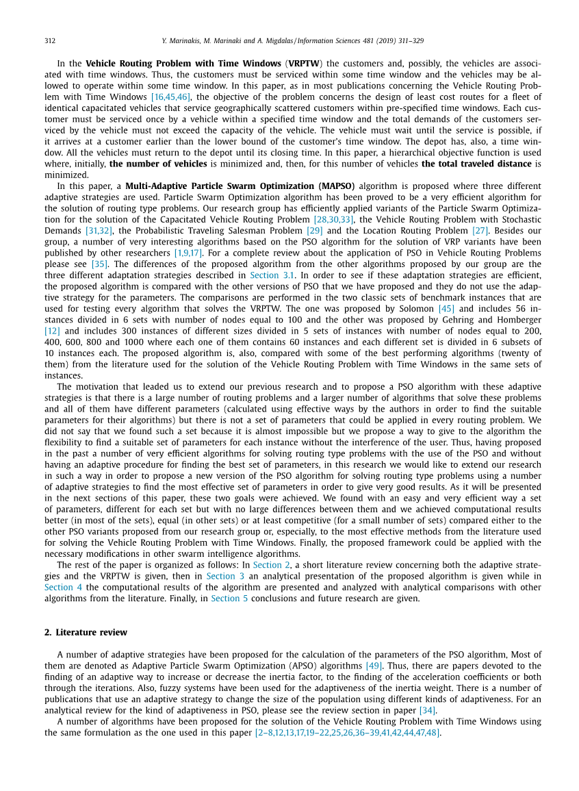 在本文中,提出了一种多自适应粒子群优化算法(MAPSO),其中使用了三种不同的自适应策略。粒子群优化算法已被证明是解决路由类型问题的一种非常有效的算法。我们的研究小组已经有效地应用粒子群优化的变种来解决容量车辆路径问题[28,30,33],随机需求的车辆路径问题[31,32],概率旅行商问题[ 29]和位置路由问题[27]。除了我们的小组之外,其他研究人员已经发表了一些基于PSO算法的非常有趣的VRP变体解决方案[1,9,17]。有关PSO在车辆路径问题中的应用的完整评论,请参阅[35]。所提出的算法与我们小组提出的其他算法的不同之处在于3.1节中描述的三种不同的自适应策略。为了确定这些适应策略是否有效,将所提出的算法与我们提出的其他版本的PSO进行比较,并且它们不使用适应性策略用于参数。比较在两组经典的基准实例中进行,这些实例用于测试解决VRPTW的各个算法。Solomon [45]提出的案例中包括56个实例,分为6组,节点数等于100,另一个由Gehring和Homberger [12]提出,包括300个不同大小的实例,分为5组节点数等于200,400,600,800和1000的实例,其中每个节点包含60个实例,每个不同的集合被划分为6个子集,每个子集10个实例。所提出的算法还与来自用于在相同的实例集中解决具有时间窗的车辆路径问题的文献中的一些最佳执行算法(其中二十个)进行比较。