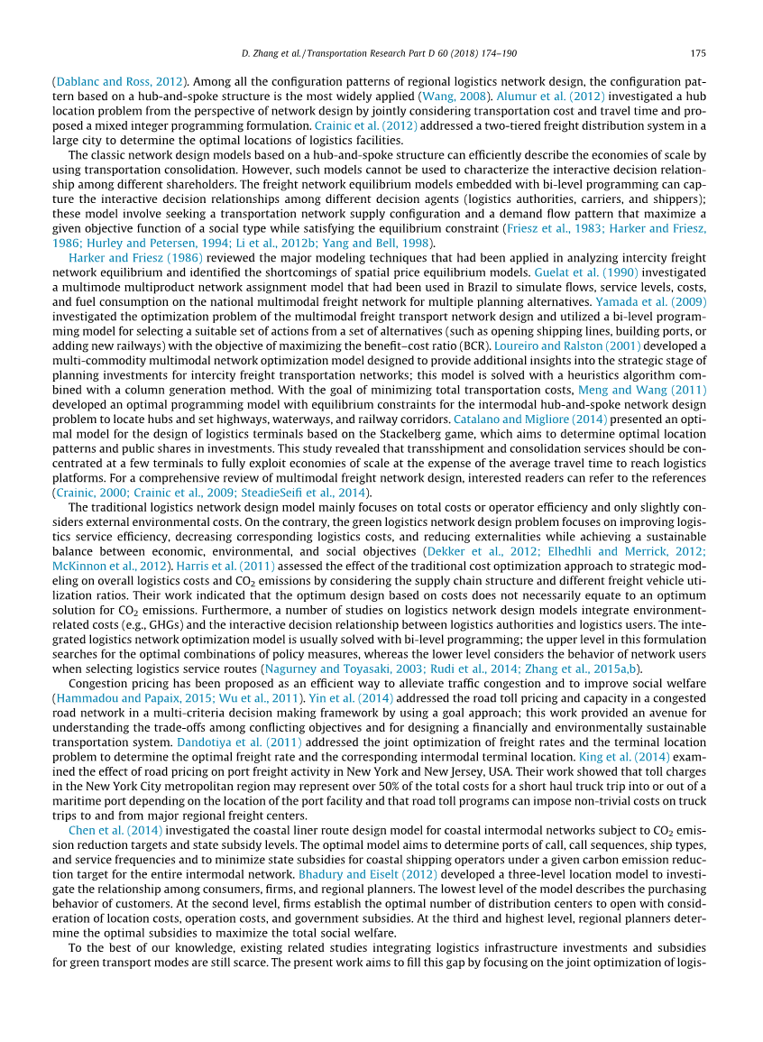 Harker和Friesz(1986)回顾了用于分析城际货运网络均衡的主要建模技术,并确定了空间价格均衡模型的缺点。 Guelat等人 (1990)研究了多模多产品网络分配模型,该模型已在巴西用于模拟多种规划方案的国家多式联运货运网络的流量,服务水平,成本和燃料消耗。 Yamada等人 (2009)研究了多式联运货物运输网络设计的优化问题,并利用双层规划模型从一组替代方案中选择了一套合适的措施(如开放航线,建设港口或增加新铁路 ),旨在最大限度地提高效益成本比(BCR)。Loureiro和Ralston(2001)开发了一种多商品多模式网络优化模型,旨在提供对城际货运网络规划投资策略阶段的更多见解;该模型通过启发式算法与列生成方法相结合来解决。为了最大限度地降低总运输成本,Meng和Wang(2011)针对联合枢纽和轮辐网络设计问题制定了一个平衡约束的最优编程模型,以确定枢纽和设置公路,水路和铁路走廊。 Catalano和Migliore(2014)提出了一个基于Stackelberg博弈的物流终端设计的最佳模型,该模型旨在确定最佳的位置模式和投资中的公众份额。这项研究表明,转运和整合服务应该集中在少数码头上,以充分利用规模经济,而平均运输时间为代价达到物流平台。对于多式联运货运网络设计的综合评述,感兴趣的读者可以参考参考文献(Crainic,2000; Crainic等人,2009; SteadieSeifi等人,2014)。