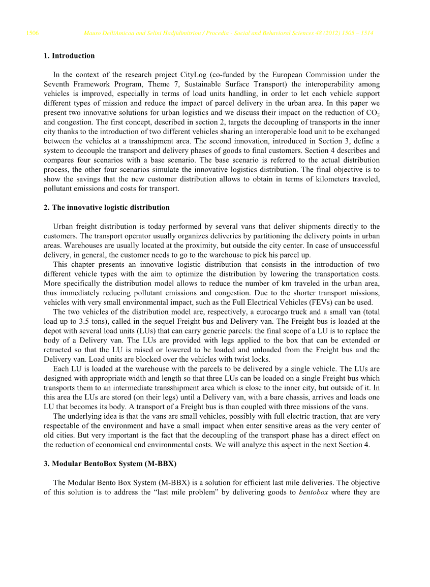 每个装载单元都在仓库中装载,并且由一辆车交付包裹。 这些装载单元的设计具有适当的宽度和长度,因此可以将三个装载单元装载到单一货运公共汽车上,将其运输到靠近市中心但在其外部的中间转运区域。 在这个区域中,装载单元被存储,直到具有裸机箱的送货车到达并加载一个成为其主体的装载单元。 货运巴士的运输与货车的三个任务相结合。其基本思想是,厢式货车是小型车辆,可能具有全电动牵引力,这些车辆非常受环境影响,并且在进入敏感地区作为老城区的中心时影响很小。 但非常重要的一点是运输阶段的耦合对减少经济最终环境成本有直接影响。 我们将在下一部分第四章中分析这方面的内容。